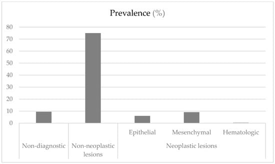 Figure 1 shows the division of the diagnosis into three groups: non-diagnostic, non-neoplastic lesions, and neoplastic lesions. Of the 264 lesions analyzed, 198 (75.0%) were non-neoplastic, 41 (15.5%) were neoplastic, and 25 (9.5%) had no definite diagnosis. Among the neoplastic diagnoses, mesenchymal lesions were the most common (9.1%).