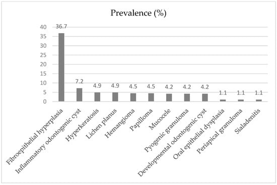 Non-neoplastic lesions were the most common in this population (75.0%), consistent with the findings of Collins et al. [28]. The most common lesion within the non-neoplastic diagnoses was fibroepithelial hyperplasia (36.7%), as in the study by Kelloway et al. [30]. Fibroepithelial hyperplasia was the most common lesion identified in this study, which was expected due to the susceptibility of the oral cavity to various traumatic and pathological stimuli. In our study, the proportion of patients using dental prostheses was high (33.7%), which is much higher than the results found in the study by Collins et al. [28] study (1.3%). Conversely, an overall higher prevalence of oral lesions has been reported in denture wearers [31,32]. Inflammatory odontogenic cyst was the second most common lesion, representing 7.2% of the total sample. This is in agreement with the study by Monteiro et al. [18], in which the odontogenic cyst was the most common lesion in the group of odontogenic tumors and cysts (8.4%). However, the prevalence may be underestimated because these lesions are often diagnosed clinically and radiographically without pathologic analysis. This is expected due to the high global and national prevalence of dental caries. More than one-third of the world’s population lives with untreated dental caries, making it the most common non-communicable disease and a major public health concern for populations and governments worldwide. The estimated global average prevalence of dental caries in permanent teeth is 29%, and the number of cases has reached more than 2 billion [10]. In Portugal, the prevalence of untreated dental caries in permanent teeth ranges from 23.3% to 30.6% [33].