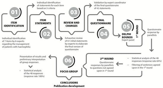 A focus group consisting of eight experts (six haematologist, one paediatric haematologist, and one pharmacist) was established based on their scientific knowledge and clinical expertise to define the concept of the “patient-centred management of well-controlled haemophilia” in haemophilia. Initially, a comprehensive literature review, with studies selected and shared by each participant, and several discussion meetings were conducted to identify seven major aspects related to the management of haemophilia patients apart from haemophilia severity, the treatment regimen, and the treatment used: disease burden, pain management, bleeding control, adherence, comorbidities, the patient’s perspective, and quality of life. Each of these domains was then thoroughly studied and analyzed in depth to draft concise and specific statements that would help to establish the concept of the “patient-centred management of well-controlled haemophilia”. This collaborative effort involved rigorous discussions, systematic reviews, and consensus-building exercises to ensure that the terminology was both comprehensive and precise. Each item was elaborated according to the following criteria: (i) short and specific sentences, (ii) clear and simple wording, (iii) potential controversy, and (iv) scientifically supported. This collaboration resulted in a questionnaire of 61 statements, which was later refined to a final version of 42 statements (Supplementary Table S1) (the project flowchart is shown in Figure 1).