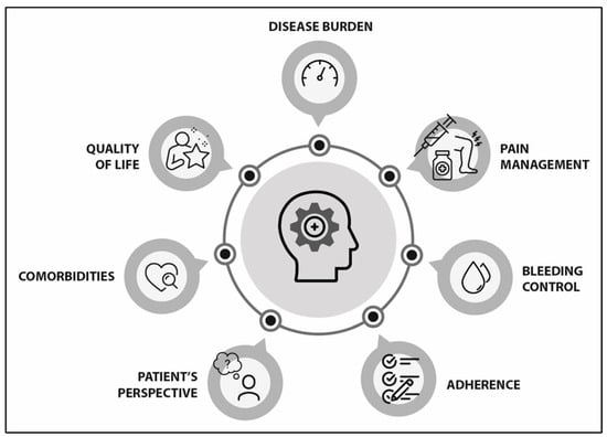 The landscape in haemophilia management is evolving very fast. New treatments achieve better therapeutic goals and patient outcomes. However, there is still room for improvement in the assessment of patient progress. Previous strategies have focused on developing a set of international standards to establish patient-relevant outcomes that should be evaluated in haemophilia [21]. However, the absence of a multidimensional tool capable of evaluating patient outcomes led a group of experts to assess in whom, when, and how haemophilia may be considered “well-controlled”. In the initial approach, the experts identified seven main domains to be considered when evaluating this new concept (Figure 2).