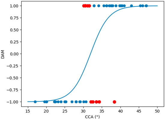 Best fit logistic regression curve of our cohort data using CCA as only regressor. Blue dots are data points correctly classified by the logistic regression model, while red dots are misclassified data points. CCA, critical coronoid angle.
