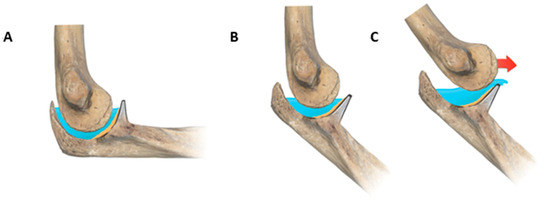 Graphic representation of the DAM index elbow theory. At 90° flexion, the tip of the coronoid is likely superior to the trochlea rotation center (A). If the elbow is semi-flexed, the center of the trochlea is out of the water (B); therefore, even a smaller force could cause elbow dislocation (C).