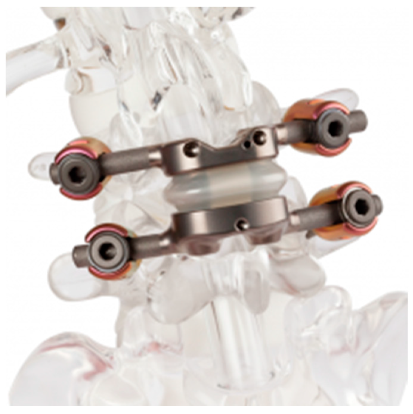 The Total Posterior Spine (TOPS) system (Premia Spine Ltd., Nowalk, CT, USA) (Figure 2) is a non-anatomic facet arthroplasty system that received FDA approval for use in the United States for patients between 35 and 80 years of age with grade 1 spondylolisthesis of L3–L5 in June, 2023, but has been on the global market since 2012. The device consists of four pedicle screws placed at adjacent levels with metal plates and a central internal motion device surrounded by a polycarbonate boot.