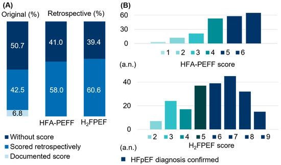 Retrospective HFpEF diagnosis in our cohort. (A) In 2020–2021, 219 HFpEF cases were verified at our center, out of which 50.7% of patients were previously diagnosed with HFpEF without using a HFpEF scoring system, and a HFpEF score was documented in 6.8%. In 42.5% of patients, HFpEF was diagnosed retrospectively in our study using the HFA-PEFF score (left). The retrospective application of the HFA-PEFF score to all patients would have allowed for the diagnosis of HFpEF (5 to 6 points) in 58.0% of patients without requiring invasive measurements (middle). The retrospective application of the H2FPEF score indicated a > 90% likelihood of HFpEF (minimum of 6 points) in 60.6% of cases. (B) The distribution of HFA-PEFF (top) and H2FPEF (bottom) score points in the study cohort. The dark blue color indicates confirmed HFpEF cases. a.n., absolute numbers.