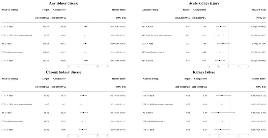 Composite kidney outcomes and CKD were consistently lower in the SGLT2i group compared to the DPP4i group across the different follow-up strategy and PS adjustment methods (HRs ranging from 0.86 to 0.89 for any kidney outcomes; HRs ranging from 0.72 to 0.75 for CKD; all statistically significant). AKI showed consistently lower risks in the SGLT2i group compared to the DPP4i group with statistical significance, except in the as-treated follow-up (Table S3). For safety outcomes, the significance of genital infection (higher risk in the SGLT2i group) and hyperkalemia (lower risk in the SGLT2i group) were consistent across sensitivity analyses (Table S4). HHF also consistently showed a lower risk in the SGLT2i group (HR from 0.70 to 0.79; Table S4).