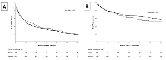 Several studies did not observe differences in the use of biological agents between FF and SF [27,30,33]. Conversely, some studies in non-Caucasian populations of adult-onset IBD suggested an increased exposure to biological agents among FF [45,46,47,48,49]. However, many of these studies had methodological limitations such as short follow-up in SF [48], a study population of Ashkenazi Jewish origin (with a high familial aggregation) [45], being small-sized, single-center studies [46,49,50], or from geographical areas with restricted access to biological drugs [46,47]. The fact that we did not find differences in the time to biological introduction is unsurprising in CD, given that active inflammation is usually the indication for starting these therapies as soon as possible.