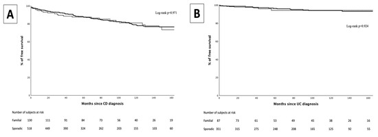 Perianal surgery-free survival curve for familial forms (dotted line) and Sporadic forms (continuous line) in Crohn’s disease (A) and in ulcerative colitis (B).