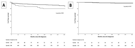 Some differences have been reported between pediatric-onset and familial forms of IBD when compared to sporadic forms (SF) of pediatric-onset IBD, including earlier age at clinical presentation and diagnosis [27], higher rates of reclassification of the IBD type [28], proximal progression (UC) [29], penetrating pattern (CD) [30] and higher enteral nutrition requirements [30]. Most of these studies were conducted before the widespread use of biological agents in pediatrics [29,31] and involved non-European populations [30] or single-center cohorts [32,33]. Studies comparing pediatric-onset FF and SF reported controversial results regarding surgical requirements, with no differences in the pre-biological era [27,29,31] but higher surgical requirements in FF in the biological era [34], particularly in UC. However, subsequent single-center and smaller studies with short follow-up periods found no differences [30,32,35,36].