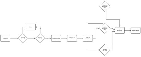All participants had to walk a 12 m corridor twice under three different conditions: (1) VACOpedes® orthosis with a vacuum inlay, (2) VACOpedes® orthosis with a XELGO® inlay and (3) standard off-the-shelf shoe (OTS, Puma Street cat). Pedobarography was performed using capacitive sensor insoles (Pedar X®, Novel GmbH, Munich, Germany) with 99 sensors. The order in which the different shoe conditions were tested was randomized (see Figure 3). Previous studies have shown good reliability of this system [,]. The peak plantar pressure, the maximum force and the mean pressure were analyzed by separating the contact area into hindfoot, midfoot and forefoot. Peak pressure was defined as the maximum load under the foot in kPa. The maximum force was defined as the highest vertical force measured by the capacitive sensors in Newtons. Mean pressure was defined as the average pressure exerted on the plantar surface of the foot. The forefoot area was further subdivided into the medial and lateral forefoot area. In addition, a barefoot measurement with a plantar pressure plate (emed, Novel GmbH, Munich, Germany) was performed to assess individual physiological foot geometry and load. The walking speed was controlled with light gates (DLS-LA Timing System, AF Sport, Wesel, Germany). The speed was allowed to vary between individuals but had to remain constant between the different shoe conditions for each subject (mean speed: 4.7 km/h ± 0.5 km/h). The wearing comfort of the VACOpedes® and XELGO® orthoses was analyzed using a visual analogue scale ranging from 1 (no comfort) to 10 (maximum comfort).