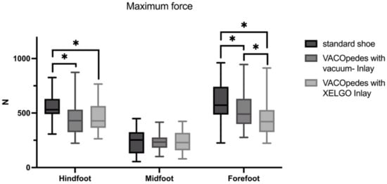 Maximum force and mean plantar pressure showed no significant differences in the midfoot (see Figure 5 and Figure 6). Both inlays of the VACOpedes® orthosis significantly decreased peak plantar pressure, maximum force and mean plantar pressure in the forefoot compared to the OTS (Figure 4, Figure 5 and Figure 6 and Table 1). Additionally, the XELGO® inlay reduces forefoot peak pressure (p < 0.001), maximum force (p < 0.001) and mean pressure (p = 0.002) significantly compared to the vacuum inlay (Figure 4, Figure 5 and Figure 6).