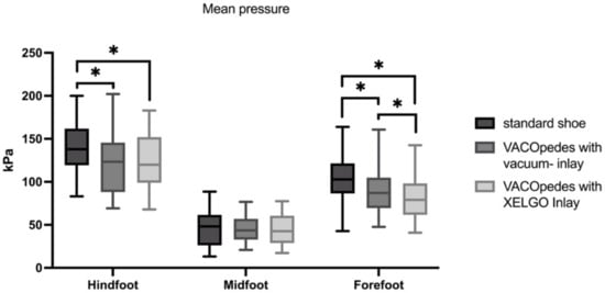 Mean Pressure in kiloPascal (kPa) for each group, separated into hindfoot, midfoot and forefoot. Data are presented in box plots, with the median of each group in the center line, the box drawn from the first to the third quartile and whiskers representing the minimum and maximum of each group. A Shapiro–Wilk test confirmed that all data were normally distributed. Significant differences are marked with * (p < 0.05).