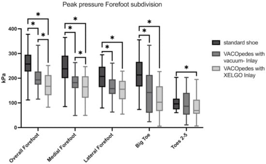 Peak pressure of the forefoot in kiloPascal (kPa) for each group, separated into overall, medial forefoot, lateral forefoot, big toe and toes 2–5. Data are presented in box plots, with the median of each group in the center line, the box drawn from the first to the third quartile and whiskers representing the minimum and maximum of each group. A Shapiro–Wilk test confirmed that all data were normally distributed. Significant differences are marked with * (p < 0.05).