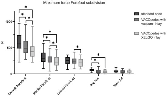 Maximum force of the forefoot in Newton (N) for each group, separated into overall, medial forefoot, lateral forefoot, big toe and toes 2–5. Data are presented in box plots, with the median of each group in the center line, the box drawn from the first to the third quartile and whiskers representing the minimum and maximum of each group. A Shapiro–Wilk test confirmed that all data were normally distributed. Significant differences are marked with * (p < 0.05).
