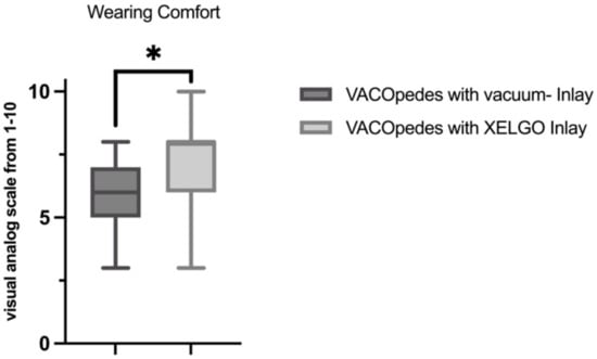 Wearing comfort for the VACOpedes with vacuum-inlay and XELGO inlay according to a visual analog scale ranging from 1–10, with 10 representing the best wearing comfort. A Shapiro–Wilk test confirmed that all data were normally distributed. Significant differences are marked with * (p < 0.05).
