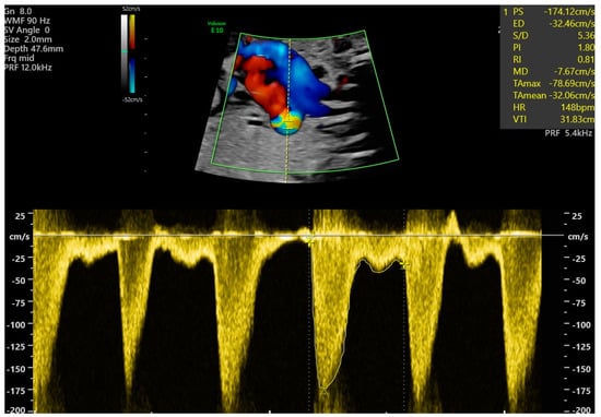- Tricuspid regurgitation seen in a four-chamber view (4CV) in a Color Doppler and in Pulsed Wave Doppler with peak systolic velocity > 1.5 m/s and duration > 80 ms [5].