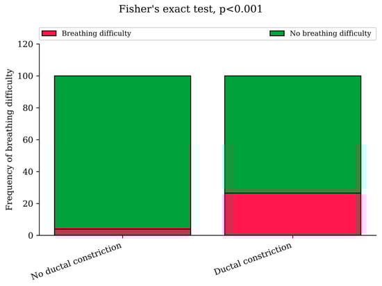 In the NHA-DC group, 27% of neonates experienced some form of respiratory problems, compared to the NHA-NDC group with 4% occurrence by Fisher’s test, p < 0.001 (Figure 2). Despite their breathing problems, there was no statistical difference in hospitalization times between neonates experiencing respiratory problems in both groups, p > 0.05. In both groups it could be seen as a decreased neonatal saturation level requiring oxygen therapy, the X-ray imaging suggesting neonate respiratory distress syndrome (RDS), or as clinical symptoms of respiratory problems in the neonate, such as intercostal retraction, cyanosis or respiratory effort (Table 3). As a breathing difficulty coexisted with diabetes in only two cases (both suffered from GDM type G2 and both were in the group without DC) it did not influence an occurrence of respiratory problems in neonates with a ductal constriction.
