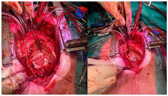The patient was scheduled dated 18 March 2024 for urgent surgery. After median resternotomy, cardiopulmonary bypass was installed using central aortic cannulation and right femoral vein and superior caval vein canulation; the inferior vena cava was inaccessible due to the pseudoaneurysm. After dissecting the heart, the aneurysm was opened at arrested heart. After debridement and removal of the dehiscent patch material, the neck of the aneurysm in the inferior wall could be visualized and reconstructed using a Dacron patch (3 × 4 cm), which was subsequently covered with a large xenopericardial patch for hemostatic purposes, as seen in Figure 4. No histological examination of the resected pseudoaneurysm was conducted, as it was not deemed necessary for clinical decision-making. Additionally, a restrictive mitral annuloplasty using an Edwards Physio ring (size 28, downsized by 2 ring sizes) and TVP (using a size 30 Edwards Physio Tricuspid annuloplasty ring) was performed.