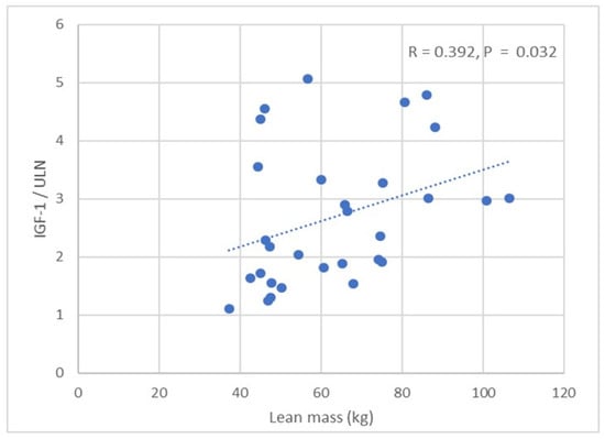 | Characteristics | IGF-1 (ng/mL) | IGF1/ULN | BMI (kg/m2) | BSA (m2) | Lean Mass (kg) | Lean Mass Trunk (kg) | Lean Mass Limb (kg) | Fat Mass (kg) | Glycated Haemoglobin (%) |