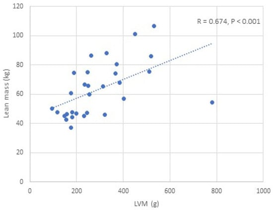 | LVM (g) | R = 0.463 p = 0.016 | R = 0.511 p = 0.004 | R = 0.532 p = 0.002 | R = 0.591 p = 0.001 | R = 0.674 p < 0.001 | R = 0.689 p < 0.001 | R = 0.593 p < 0.001 | R = 0.323 p = 0.082 | R = −0.473 p = 0.008 |