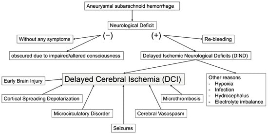 DCI has been linked to various factors, including cerebral vasospasm, microcirculatory disorder, microthrombi, and cortical spreading depolarization. Figure 1 illustrates the factors associated with DCI.