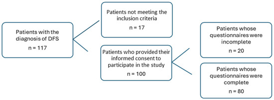 This was an observational, single-center cross-sectional study, conducted in the general and vascular surgery department on the day of hospital admission. The data were collected over a period of 6 months. At that time, 117 patients diagnosed with DFS were hospitalized in the department. In this group, 17 patients did not meet the criteria for inclusion in this study. Ultimately, 80 patients participated in this study (Figure 1).