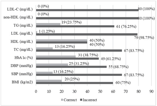 The data showed that all the patients had abnormal values of non-HDL and LDL-C. Abnormal values of LDL occurred in 98.75% of the patients, and 83.75% of the participants had abnormal values of the systolic pressure and total cholesterol. The HbA1c index was abnormal in 61.25% of the subjects (Figure 2).