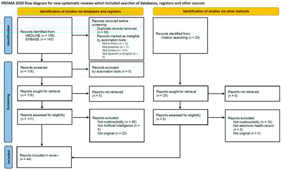 We conducted a systematic review of the peer-reviewed literature in MEDLINE and EMBASE, following the Preferred Reporting Items for Systematic reviews and Meta-Analyses (PRISMA) statement guidelines []. The detailed PRISMA checklist is provided in the Supplementary Material. The search strategy combined algorithms for multimorbidity, artificial intelligence, and electronic health records (see Appendix A).