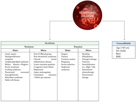 VTE risk factors can be classified as unmodifiable and modifiable (or acquired), which can be further divided into transient and persistent (Figure 1) [1].
