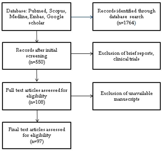 For the timeline from January 1984 to January 2024, a search was conducted on the main scientific platforms: Pubmed, Scopus, Medline, Embase, and Google scholar. Using the MeSH database, we initially found a total of 1764 articles, matching “eFAST, ultrasound AND emergency department, emergency medicine, trauma management, ABCDE”. A second screening reduced the number of eligible articles to a total of 550, from which abstracts of meetings, unavailable manuscripts (original articles, meta-analyses, and systematic reviews), original articles without abstracts, and brief reports were excluded, leaving only relevant articles related to emergency medicine, critical or intensive care medicine, and acute medicine. In addition, the reference lists of each article were reviewed to find relevant articles to include, and finally, 97 articles were analysed in this clinical review. (Figure 1).