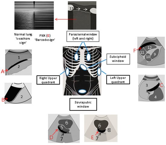 Emergency sonographic techniques include focused echocardiography, as well as thoracic and abdominal US []. The most widely used technical approach consists of the evaluation of four sonographic windows [], and up to 6 in the extended version, as it also includes the parasternal views (P1 and P2) to assess the thorax []. These should be examined in a circular manner, approaching the patient from the right side, looking for the presence of fluid or air presence or organ damage (Figure 2):