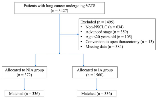This retrospective study was approved by the ethics committee of TSGH, which waived the need for informed consent (TSGHIRB No: 1-107-05-008). Relevant data were retrieved from medical records and the electronic database at TSGH for patients classified as American Society of Anesthesiologists (ASA) I to III who underwent elective VATS for tumor–node–metastasis (TNM) stage 0 (carcinoma in situ) to II NSCLC between January 2015 and December 2022. Patients included in the study received either NIA or IA, based on a collaborative decision between the anesthesiologist and surgeon, taking into account the patient’s medical history, preoperative findings, and surgical preferences. Exclusion criteria were non-NSCLC histology, advanced-stage disease (III to IV), ASA class IV or higher, age below 20 years, emergency surgery, and incomplete data. In addition, patients who underwent conversion to open thoracotomy were excluded during cohort selection to ensure comparability between minimally invasive approaches and to clarify the impact of the anesthesia modality.