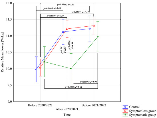 Comparison of mean values and confidence intervals for the Relative Mean Power variable by group and study time. p—p-value; d—Cohen’s d effect size.