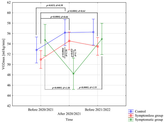 Comparison of means and confidence intervals for the VO2max variable by group and study time. p—p-value; d—Cohen’s d effect size.