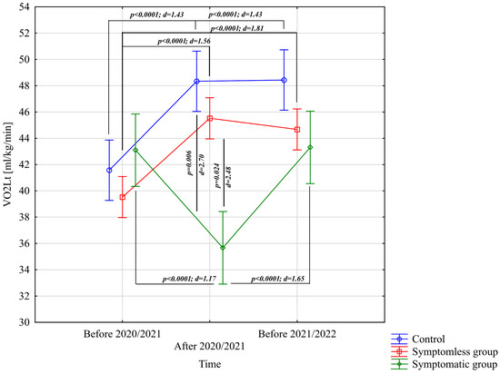 Comparison of mean values and confidence intervals for the VO2Lt variable by group and study time. p—p-value; d—Cohen’s d effect size.