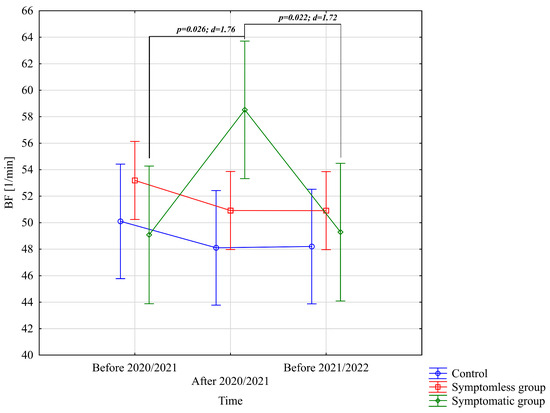 Comparison of mean values and confidence intervals for the BF [1/min] variable by group and study time. p—p-value; d—Cohen’s d effect size.
