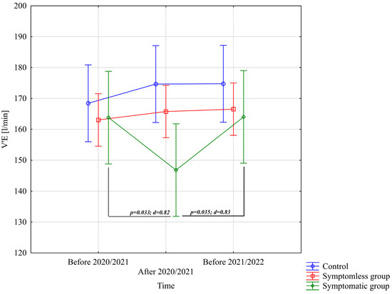The analysis of V’E [L/min] demonstrated significant differences only for the interaction between group and study time (p = 0.00073; η2 = 0.18). Further analysis of the group × study time interaction for the V’E [L/min] variable indicated significantly lower values in the WSG SpO2 < 90% group after the preparatory period 2020/2021 compared to the periods before the preparatory periods of both 2020/2021 and 2021/2022 (Figure 5).