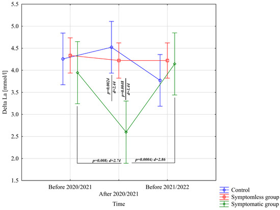 The analysis of ΔL [mmol/L] demonstrated significant differences for the main effect of study time (p = 0.011; η2 = 0.091) and the interaction between group and study time (p = 0.0002; η2 = 0.21). Further analysis of the group × study time interaction for the ΔL [mmol/L] variable indicated significantly lower values in the WSG SpO2 < 90% group after the preparatory period 2020/2021 compared to the periods before the preparatory periods of both 2020/2021 and 2021/2022 (Figure 6).