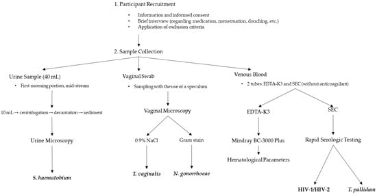 The aim of the present study was to assess the prevalence of STIs (Trichomonas vaginalis, Neisseria gonorrhoeae, Treponema pallidum, and HIV-1/HIV-2) and urogenital schistosomiasis, as well as to evaluate hematological parameters and nutritional status, in a population of women residing in Ambatoboeny District, northern Madagascar.