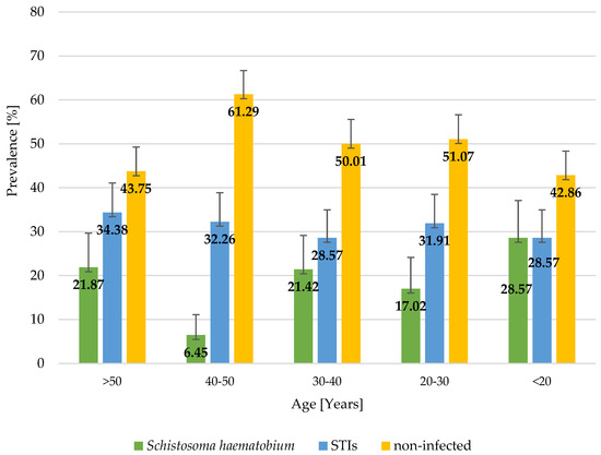 A total of 159 women aged 15–80 years were involved in the study. Most of the study participants had primary education (42.1%), followed by secondary education (31.5%) and tertiary education (7%); 18.9% of the study participants had no formal education, and one person did not give an answer to the question regarding her education level. Most of the study participants had normal BMIs, 35 women were underweight, 31 were overweight, and 7 were obese (1 of these women was diagnosed with morbid obesity > 40 kg/m2). The analysis of the hematological parameters (hemoglobin measurements) demonstrated that 66% of the women involved in the study had anemia; 14 of the women were diagnosed with moderate anemia, and 5 with severe anemia. One in three women (31.5%) was found to have at least one STI, and 17.6% of the study participants were found to be infected with Schistosoma haematobium. The results showed that the most prevalent STIs included infections caused by Neisseria gonorrhoeae (20.1%), followed by Trichomonas vaginalis (8.8%) and Treponema pallidum (7.6%). Also, there was a single case of HIV infection. A total of 7.6% of the women included in the study were found to have co-infections, of which T. pallidum + N. gonorrhoeae co-infection was the most prevalent. The study found that STI infection rates were higher in women with hemoglobin concentrations below the reference values and in women with an abnormal BMI (40% of underweight women, 32.3% of overweight women, and 71% of women with obesity). However, those differences were not statistically significant (p-value > 0.05). Regarding S. haematobium infection rates, no correlation was found between BMI or the presence of anemia and the occurrence of this infection. The level of education was not shown to significantly affect STI rates; however, most infections were seen in women with primary education (10% more than in all other groups). The number of S. haematobium cases was found to decrease with a higher level of education. There were no cases of S. haematobium infection in women with tertiary education. The distribution of STIs and Schistosoma haematobium infections in women by anemia, BMI, and level of education is shown in Table 1. The prevalence of STIs was found to be similar in all age groups (around 30%), while the prevalence rate of S. haematobium infections differed between individual age groups, with the highest prevalence seen in the age group below 20 years and the lowest in the age group comprising women aged between 40 and 50 years. The distribution of STIs and Schistosoma haematobium infections by age is shown in Figure 2.