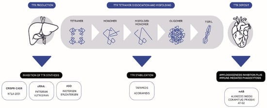 - Aimo, A.; Castiglione, V.; Rapezzi, C.; Franzini, M.; Panichella, G.; Vergaro, G.; Gillmore, J.; Fontana, M.; Passino, C.; Emdin, M. RNA-targeting and gene editing therapies for transthyretin amyloidosis. Nat. Rev. Cardiol. 2022, 19, 655–667. [Google Scholar] [CrossRef] [PubMed]
