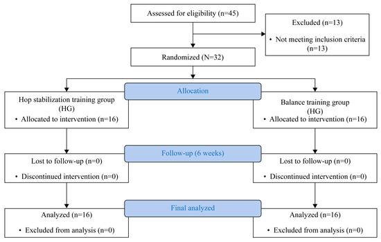 In total, 32 adolescent female basketball players from eight teams were enrolled, and all participants completed the study without any dropouts. Teams were cluster-randomized, with four teams allocated to the hop-stabilization training group (HG; n = 16) and four teams to the balance training group (BG; n = 16).