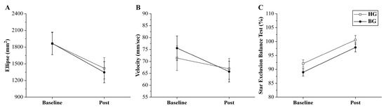 Regarding the Star Excursion Balance Test, a significant time × group interaction effect was not observed (p = 0.818; Δ = 2.67; 95% CI: −1.94 to 7.28; = 0.002). However, a significant main effect of time (p < 0.001) that supported the post hoc analysis of within-group differences was observed. The within-group analysis showed that both the HG and BG experienced significant improvement after the intervention (p < 0.001 for both groups).