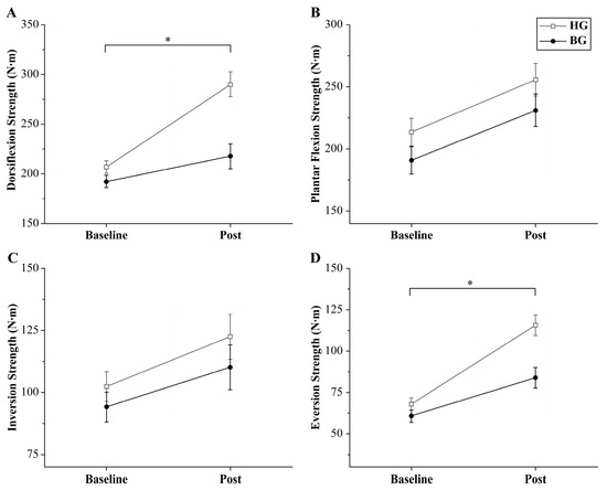 Changes in isometric ankle strength. Significant time × group interaction effects were observed for dorsiflexion (A) and eversion strength (D) (* p < 0.05). Significant time × group interaction effects for plantar flexion (B) and inversion strength (C) were not observed. Error bars indicate the standard error of the mean (SEM). HG: hop-stabilization training group; BG: balance training group; Post: after the intervention.