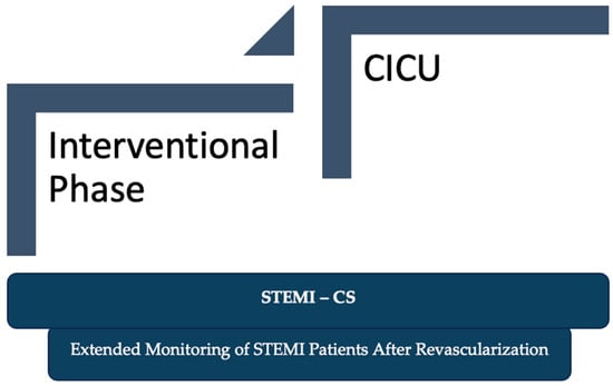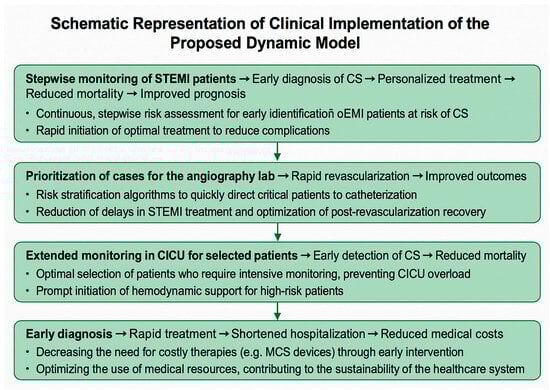 Thus, this study’s main objective is to improve clinical decision-making in STEMI-CS management by supporting the development of AI-assisted protocols aimed at early and personalized intervention. The added value of this research lies in extending risk monitoring for cardiogenic shock beyond the early phases previously addressed in the literature, into the post-revascularization stages; specifically, interventional cardiology and cardiac intensive care phases of care. The proposed model is dynamic and phase-specific, covering the entire continuum of care for STEMI patients—from initial medical contact, through diagnostic and interventional treatment, to intensive care monitoring. As illustrated in Figure 3, this model can be translated into a structured clinical care pathway, with a focus on early diagnosis, treatment prioritization, and optimal resource utilization.