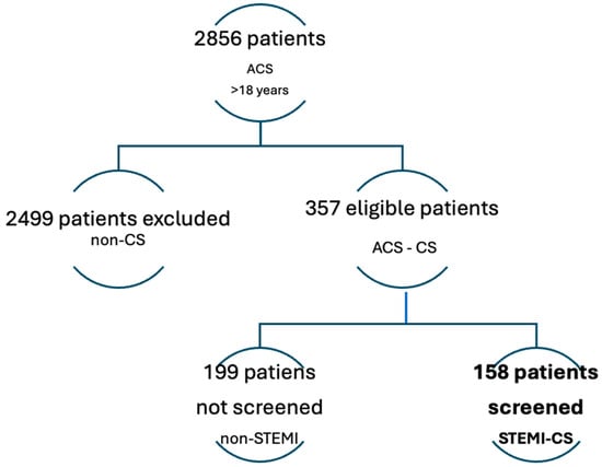 This retrospective observational study included data from 2856 adult patients (>18 years) admitted with acute coronary syndrome (ACS) [] at the University Emergency Hospital of Bucharest between 2019 and 2022. Of these, 357 were diagnosed with cardiogenic shock (CS) as per contemporary clinical criteria []. After excluding cases not attributed to ST-elevation myocardial infarction (STEMI), 158 patients with confirmed STEMI-CS were selected for analysis, as shown in Figure 4.
