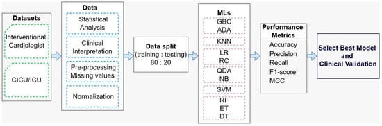 Two datasets (marked with a green color) with real clinical data were used: interventional cardiologist and CICU units. These datasets capture the patient’s progression through various stages of care. The data were systematically processed through a series of steps, including statistical analysis, clinical interpretation, handling of missing values, and normalization (each marked in blue), to ensure consistency and quality throughout the study. The pre-processed data were split into training and testing sets in a 80:20 ratio for training and testing of eleven ML models (marked with a purple color) such as: tree-based (Extra Trees—ET, Random Forest—RF, Decision Tree—DT), probabilistic (Quadratic Discriminant Analysis—QDA, Naïve Bayes—NB), margin-based (Support Vector Machine—SVM), linear models (logistic regression—LR, Ridge Classifier—RC), distance-based (K-Nearest Neighbors—KNN), and boosting methods (Gradient Boosting—GBC, AdaBoost—ADA). To ensure reliable model selection and reduce the risk of overfitting, 5-fold cross-validation was applied exclusively to the training data. The training set was divided into five subsets: in each fold, four subsets were used for training, while the remaining subset was used for validation. Hyperparameters were optimized based on the average performance across the validation folds. Once the model was finalized through cross-validation, it was retrained on the full training set and evaluated on the hold-out 20% test set to measure its ability to generalize to new data.