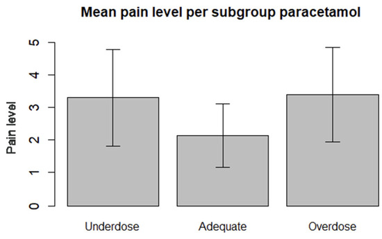 Frequency distribution of the mean pain levels of the different subgroups regarding the use of acetaminophen. Overdose (acetaminophen average of 6.7 g/day), underdose (average acetaminophen of 1.5 g/day), and adequate (3–4 g/day).