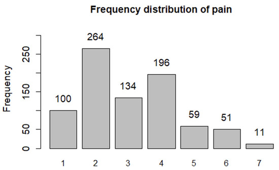The dependent variable, pain, exhibited an approximately normal distribution (Figure 3). The skewness and kurtosis of the distribution were 0.55 and −0.38, respectively. The mean pain score after discharge was 3.06 ± 1.46. No outliers were observed for the dependent variable. To test whether the mean pain level of the adequate subgroup differed from that of the other two groups, we computed a dummy contrast variable.