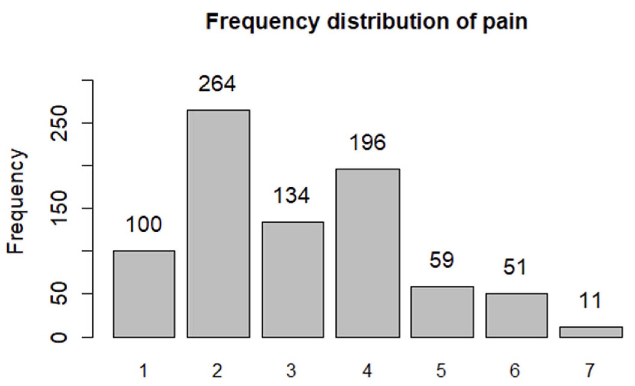 Frequency distribution of the pain scores on a 7-point numeric scale based on the short reports after discharge.