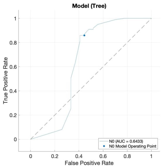 Employing a t-SNE dimension reduction prior to algorithm training, a distinct spatial separation of nodal positive tumors vs. nodal negative tumors was not feasible (Supplementary Materials Figure S2). In order to ensure robust algorithm performance, data were split into two separate cohorts: a training cohort for initial classifier training and an independent validation cohort for consecutive performance testing on previously unknown data. Our training data set included 126 patients (27 with groin lymph node affections and 99 without inguinal lymph node metastasis); our test data set comprised 31 patients (6 with groin lymph node affections and 25 without inguinal lymph node metastasis). As a supervised learning approach, we trained a tree algorithm to predict the class “absence of inguinal lymph node metastasis/N0” and achieved an internal accuracy (right classifications/all classifications) of 79.4%, with a corresponding AUROC value = 0.64 (Figure 1, positive class: “absence of inguinal lymph node metastasis/N0”). The TPR (true positive rate) for the detection of absent lymph node affections was 85.9% and correspondingly 55.6% for the correct classification of positive groin lymph node involvement. The resulting PPV (positive predictive value) for diagnosing a patient correctly as tumor stage N0 was 87.6%, and for identifying a lymphatic spread accurately employing our proposed algorithm and the histomorphological biomarkers put to the test, it was 51.7%. Table 2 depicts the classifier performance and metrics based on the internal classifier validation process.